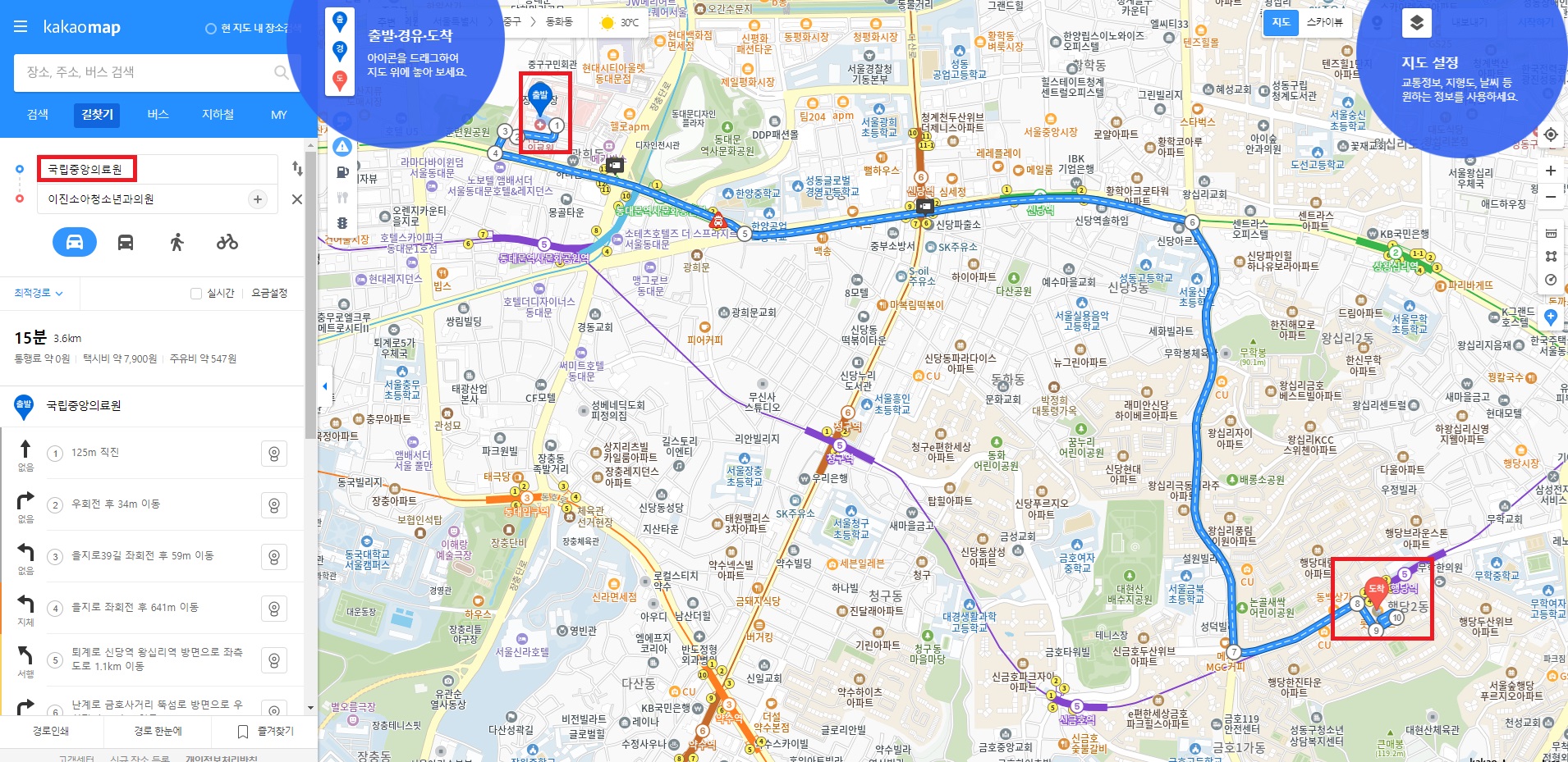 상세보기의 우측 상단의 길찾기 버튼을 누르면 아래와 같이 상세지도가 나오는데 본인의 현재 위치를 좌측의 출발지에 입력하시면 가고자하는 병원, 의원 및 약국까지 걸리는 시간이 대중교통, 자가용, 도보, 자전거 등으로 구분되어 알 수 있습니다.