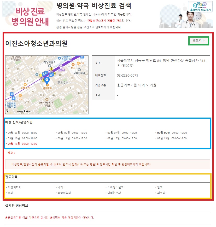 상세보기를 누르면 다음과 같이 해당 병원, 의원, 약국의 주소 및 전화번호, 비상 진료 및 운영시간, 진료과목, 실시간 병상정보 등이 나오는데 이를 확인하신 후 찾아가시면 됩니다.