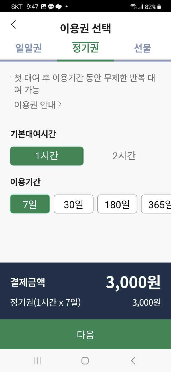 여기서 주의할점은 일일권 1시간이 1,000원의 이용 요금인데, 1시간이 되었다고 그만 타야하는 것이 아니라, 1시간이 되는 시점에 반납을 하였다가 또다시 1시간을 빌려 탈 수 있다는 점입니다. 저는 아직 이용을 해본적이 없어서 1시간에 1,000원이면 그렇게 싼것도 아니네...했었지요