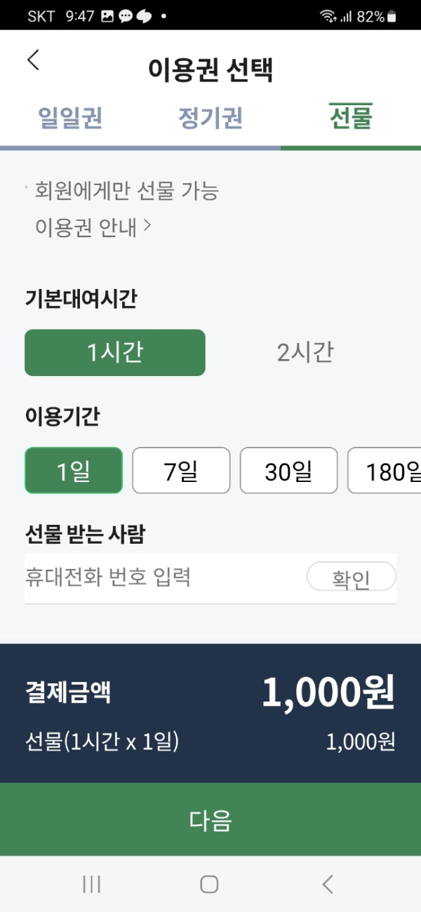 요금은 일일권 1시간(1,000원), 2시간(2,000원)과 정기권(30일, 180일) 그리고 선물하기가 있습니다.