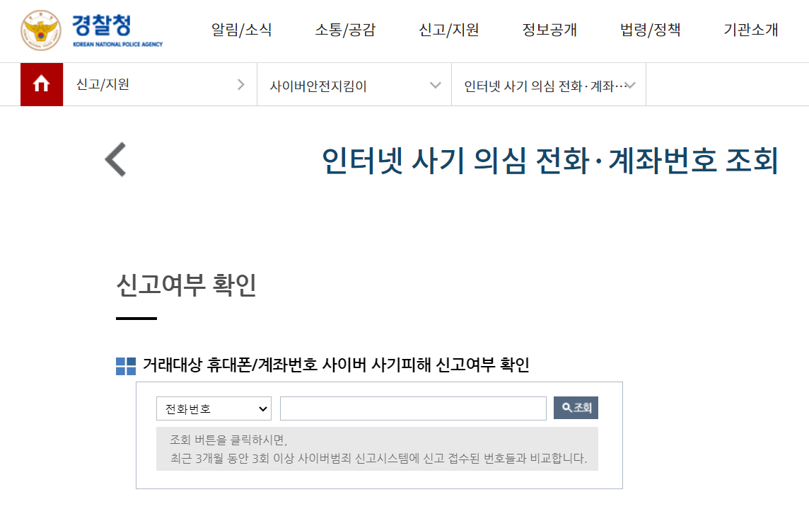 경찰청 사이버수사국-사이버 사기의심 번호조회